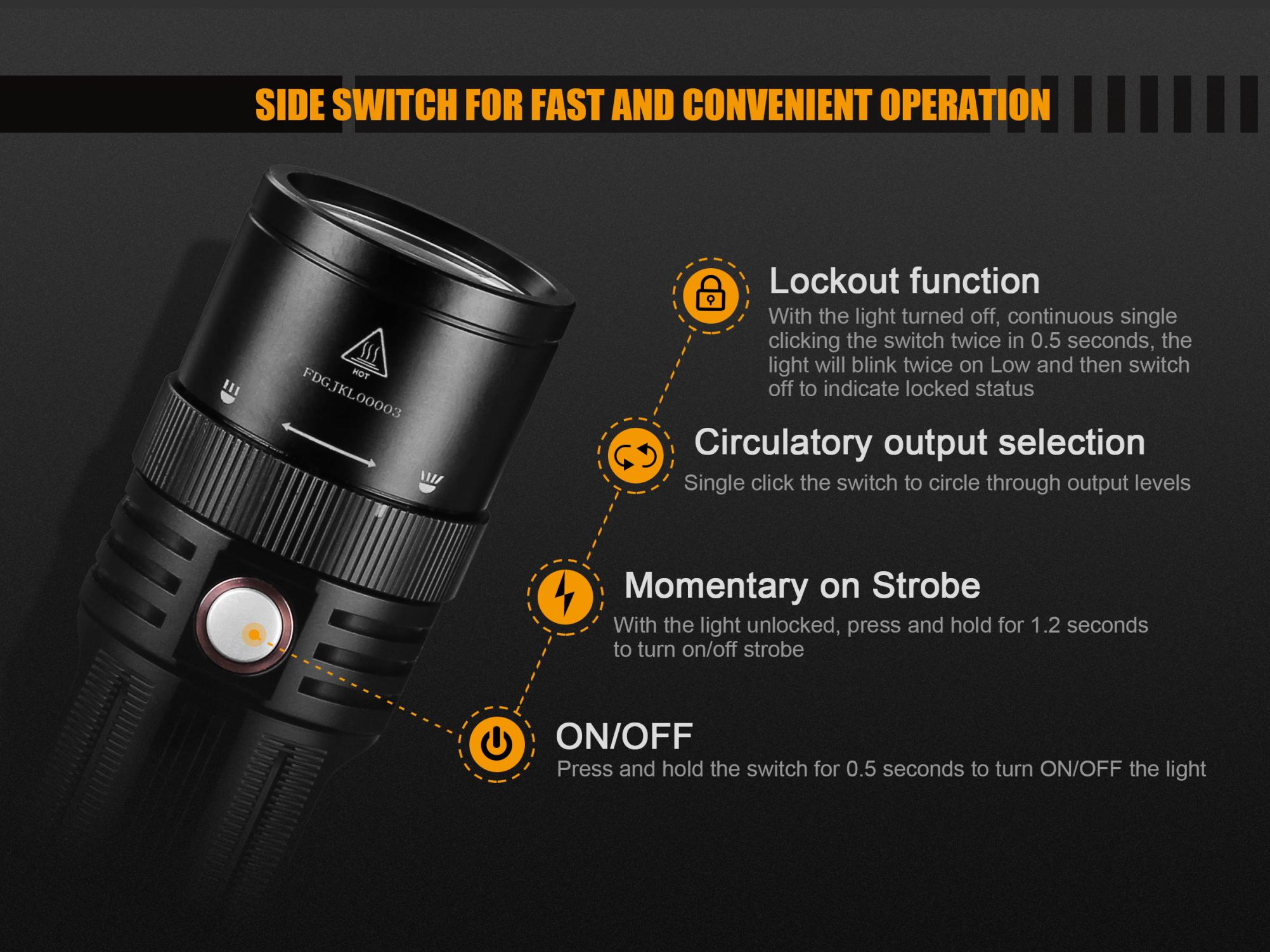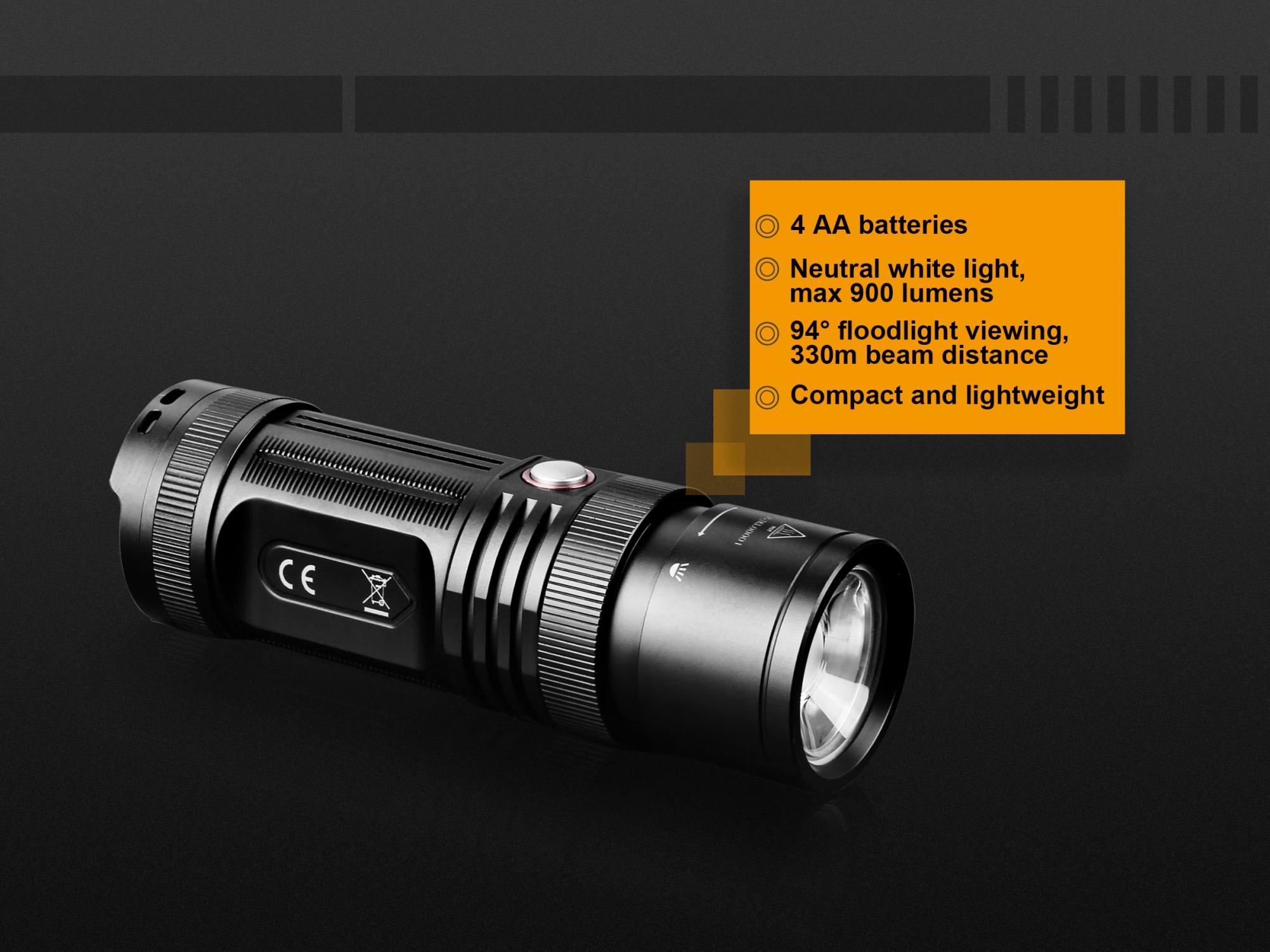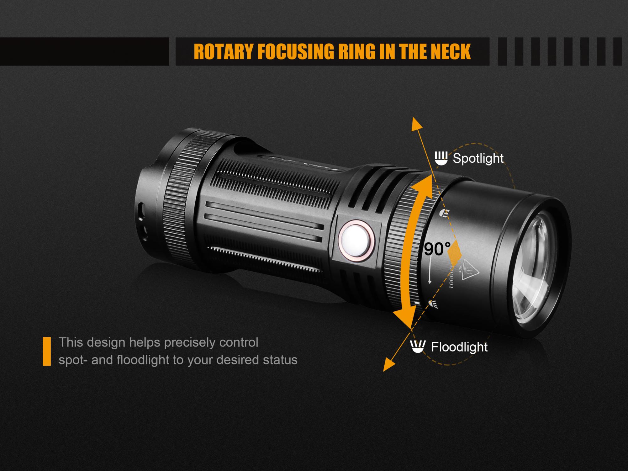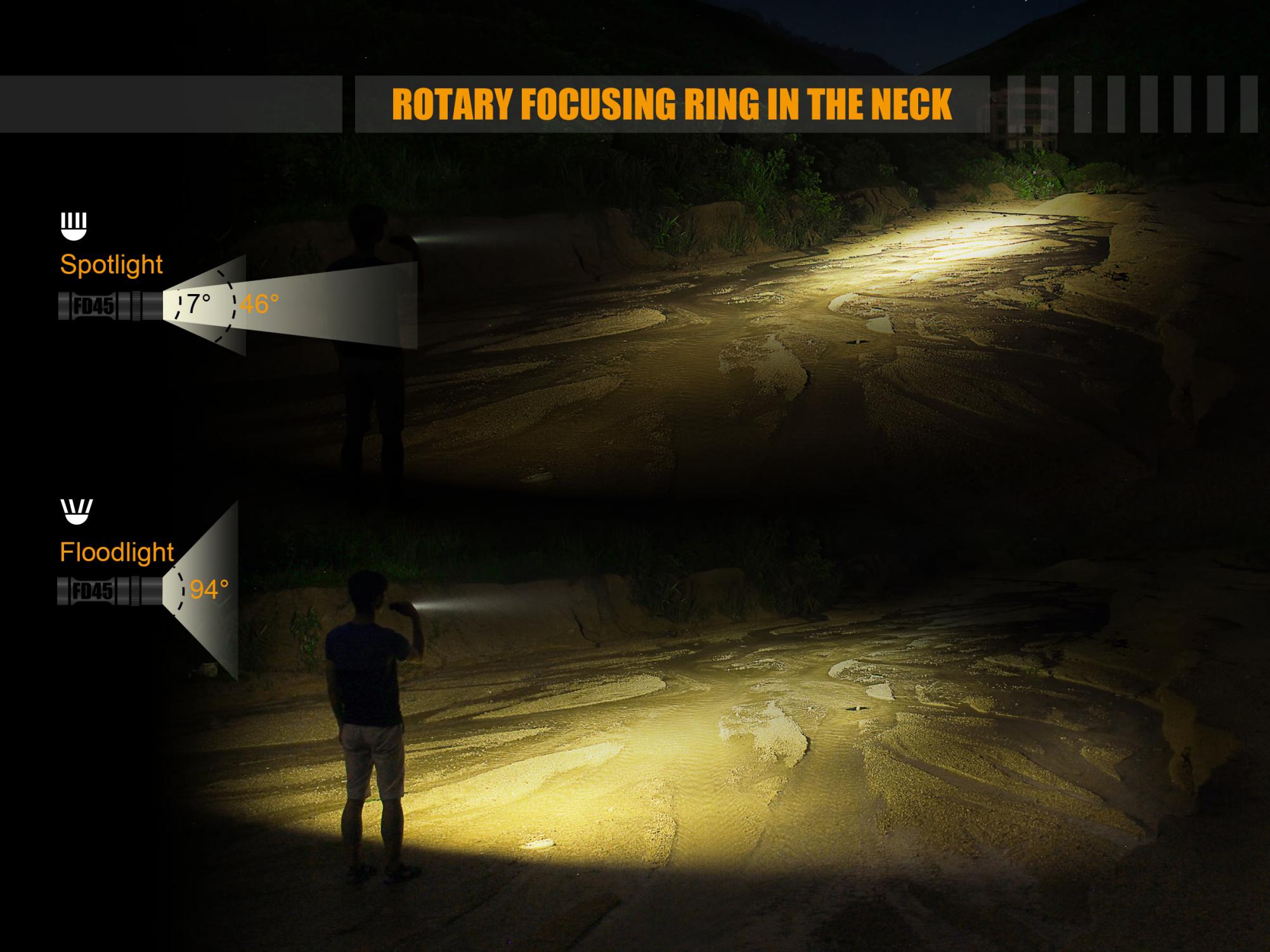 Šírka kužeľa (funkcia zoom) sa ovláda otáčaním krúžku na hlavne svietidla so zarážkami v oboch krajných polohách. Na najužšie nastavenie má stred kužeľa šírku cca 7°, na najširšie nastavenie je kužeľ plynulý s celkovým záberom 94°. Aj napriek nastaviteľnej optike si svietidlo zachováva plnú vodotesnosť podľa štandardu IP68 až do hĺbky dva metre pod vodou. Na ovládanie slúži tlačidlo ergonomicky umiestnené na boku svietidla, ktorým možno voliť z piatich režimov stáleho svietenia s výdržou až 200 hodín a dvoch zábleskových režimov. Ak hľadáte čo najvýkonnejšie a zároveň kompaktné zaostrovacie svietidlo na bežné tužkové batérie, potom je Fenix FD45 presne pre vás.
