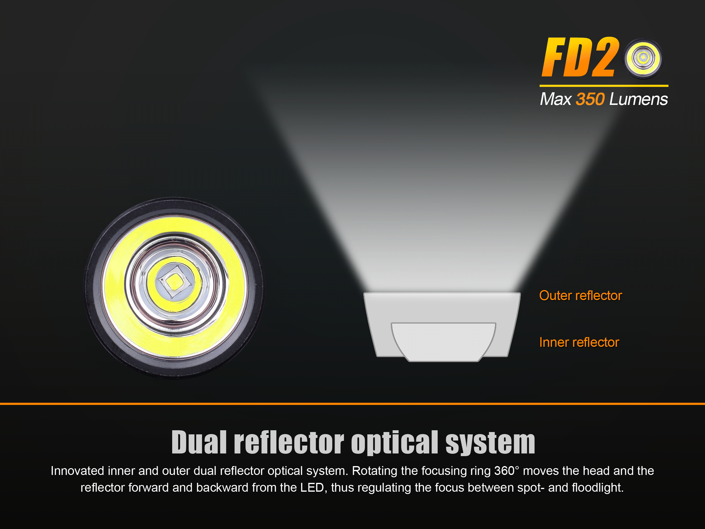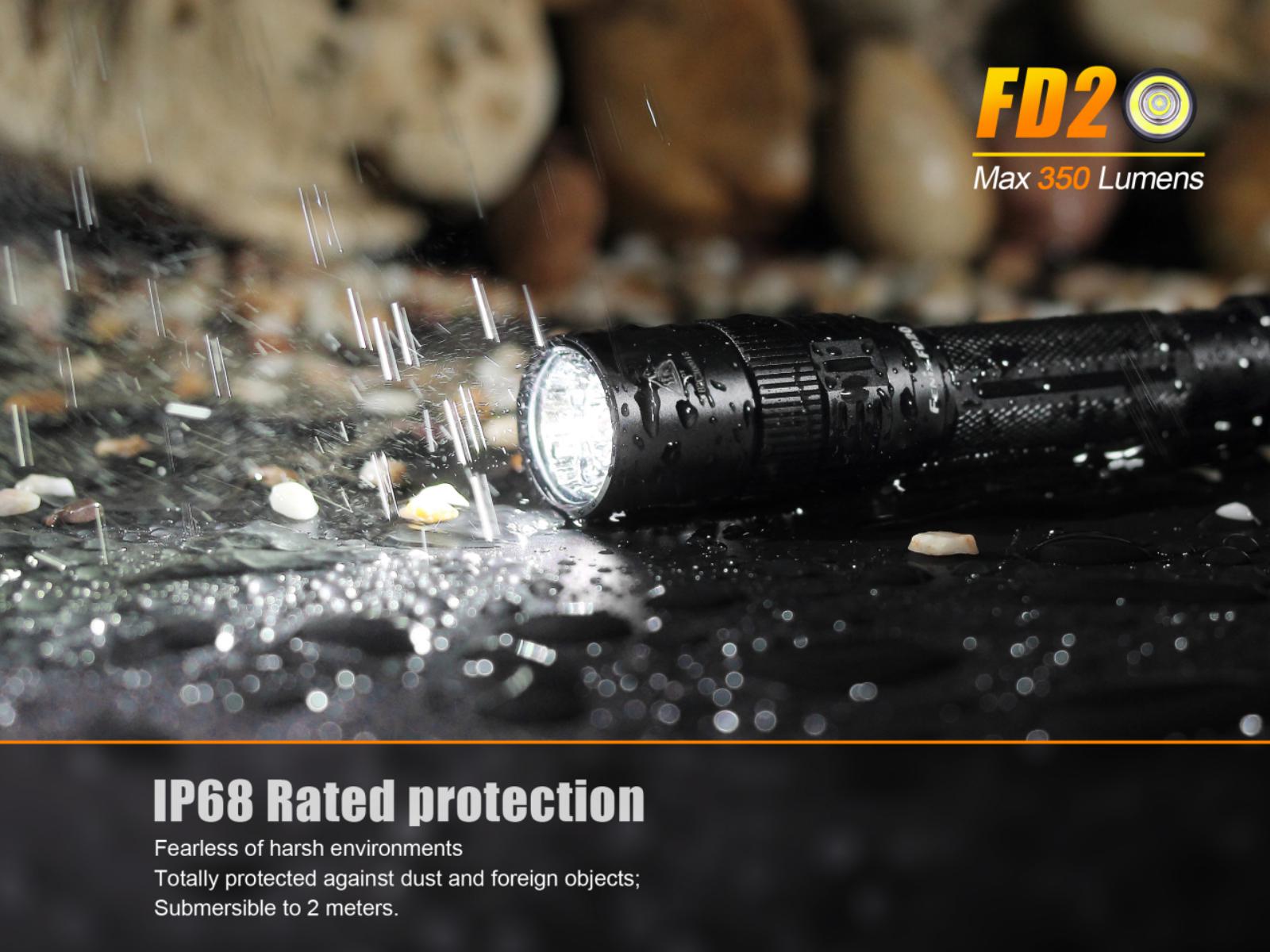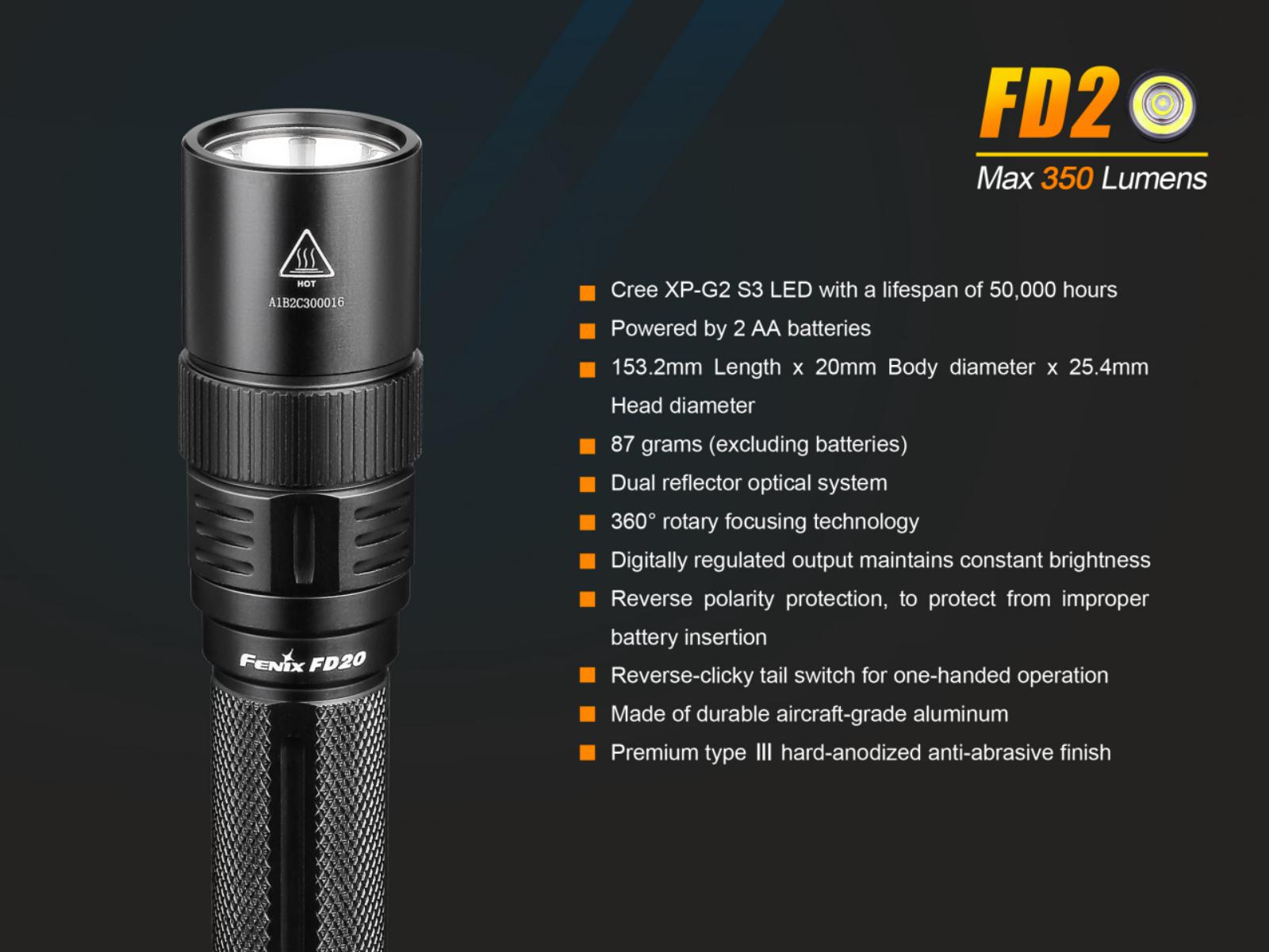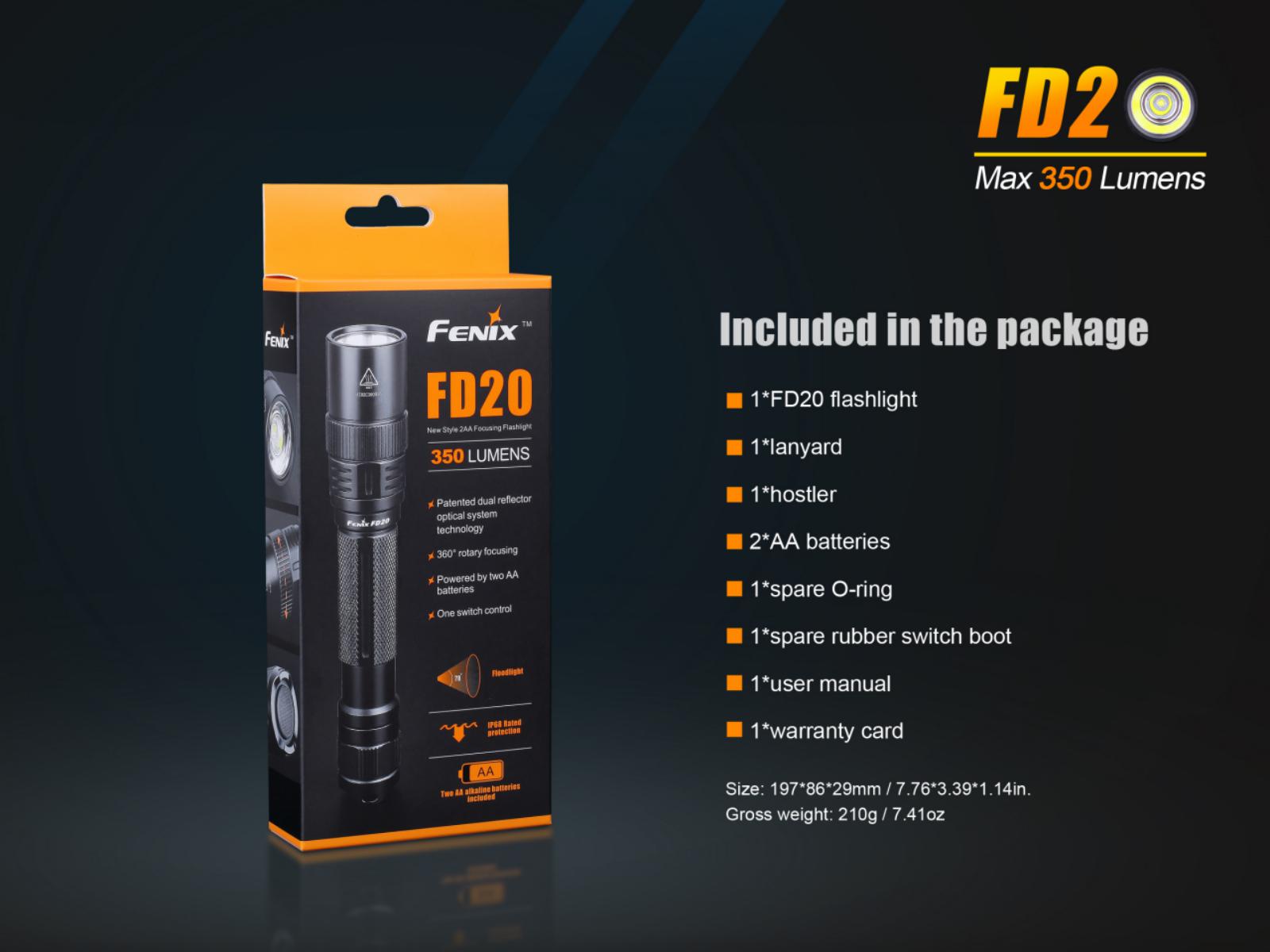 Zoomovacia baterka Fenix FD20 ponúka vysoký svetelný tok a dosvit. Má jednoduché ovládanie a štyri úrovne svetelného výkonu. Šírka ohniska svetelného kužeľa sa ovláda otáčaním krúžku na hlavne baterky. Aj napriek nastaviteľnej optike si svietidlo zachováva plnú vodotesnosť. Ovládanie i zapínanie je riešené koncovým tlačidlom. Na napájanie používa dve bežne dostupné tužkové AA batérie, samozrejme možno použiť jednorazové i nabíjateľné. Vďaka elektronike s konštantnou reguláciou prúdu poskytuje stály svetelný výkon aj pri znižovaní napätia v batériách (pri ich pozvoľnom vybíjaní). Toto svietidlo je ideálnym svetelným nástrojom s vynikajúcim pomerom vysokého výkonu, kvality a ceny.