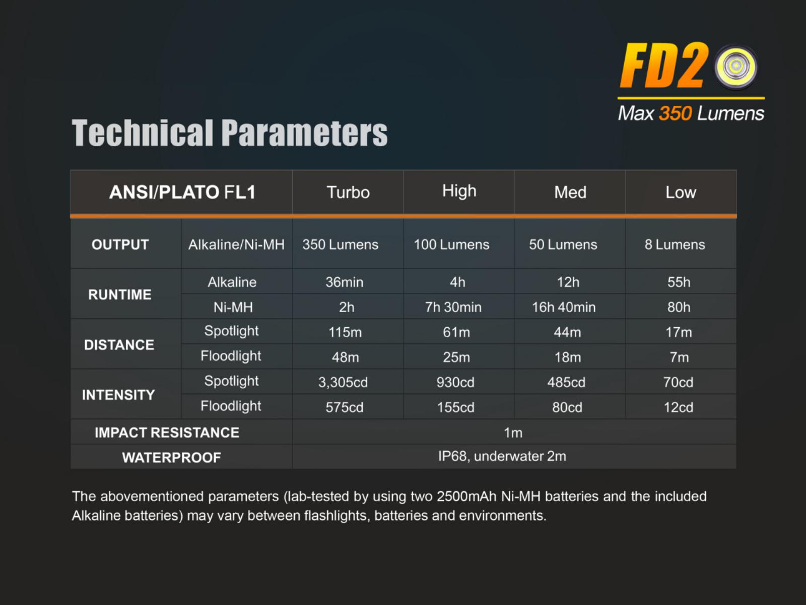 Všetky parametre svietidla (svetelný tok, doba svietenia na batérie, vodotesnosť, dosvit a nárazuvzdornosť) sú merané v súlade s normou ANSI/NEMA FL 1-2009 Flashlight Basic Performance Standard.