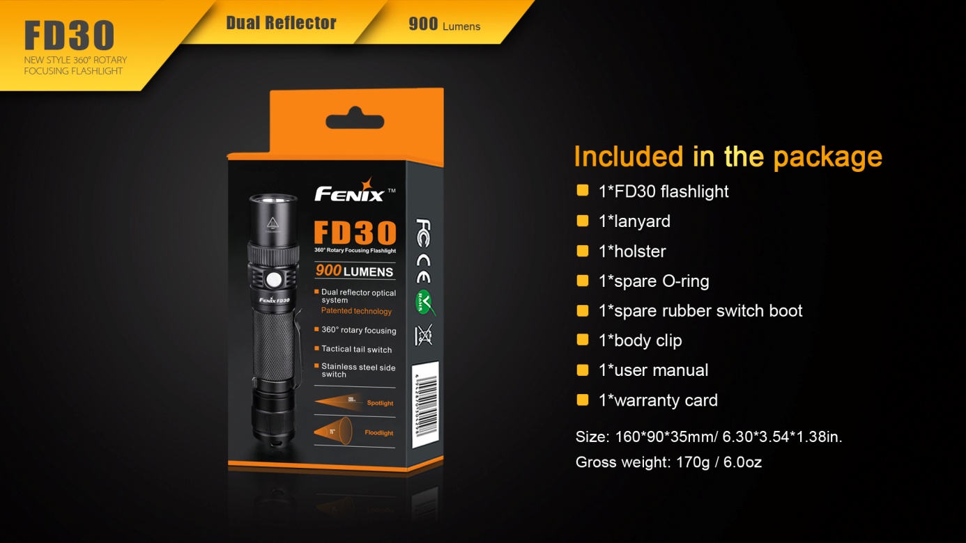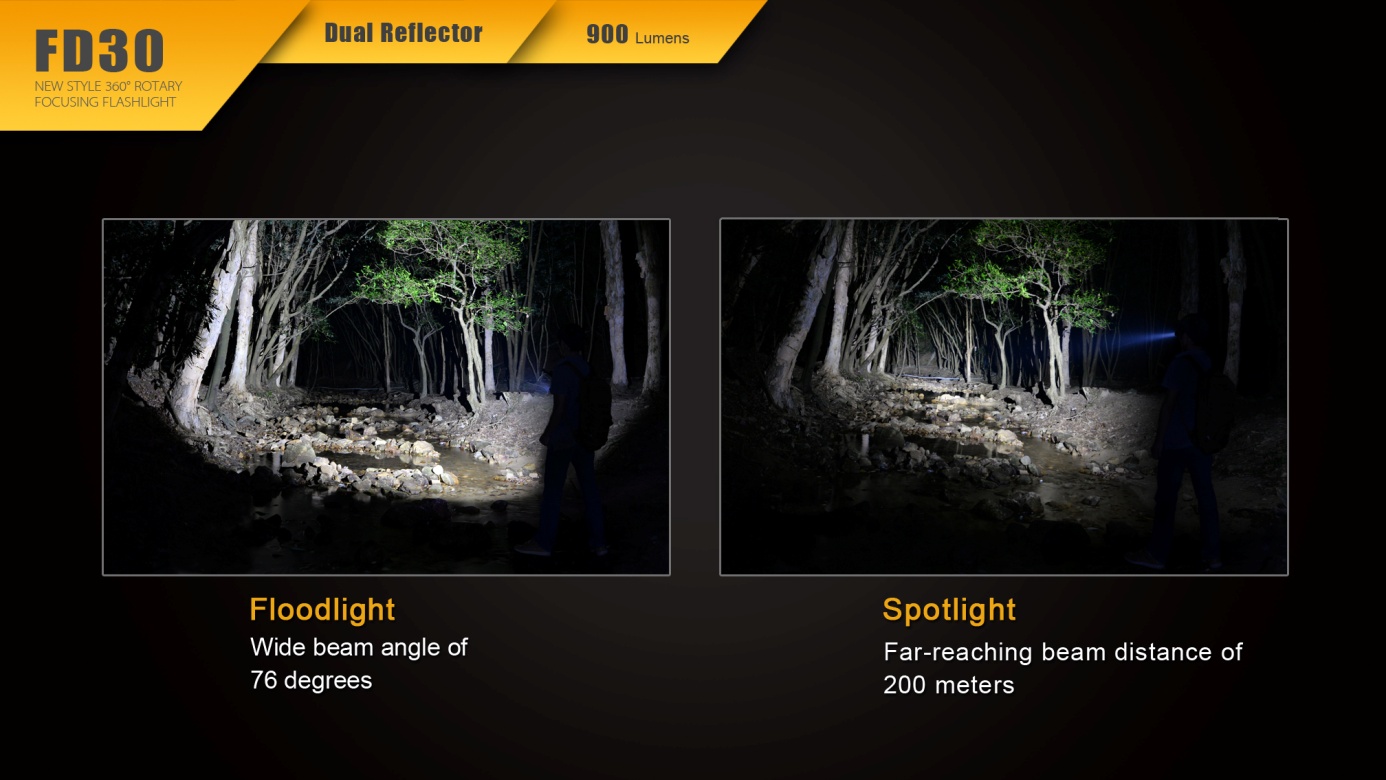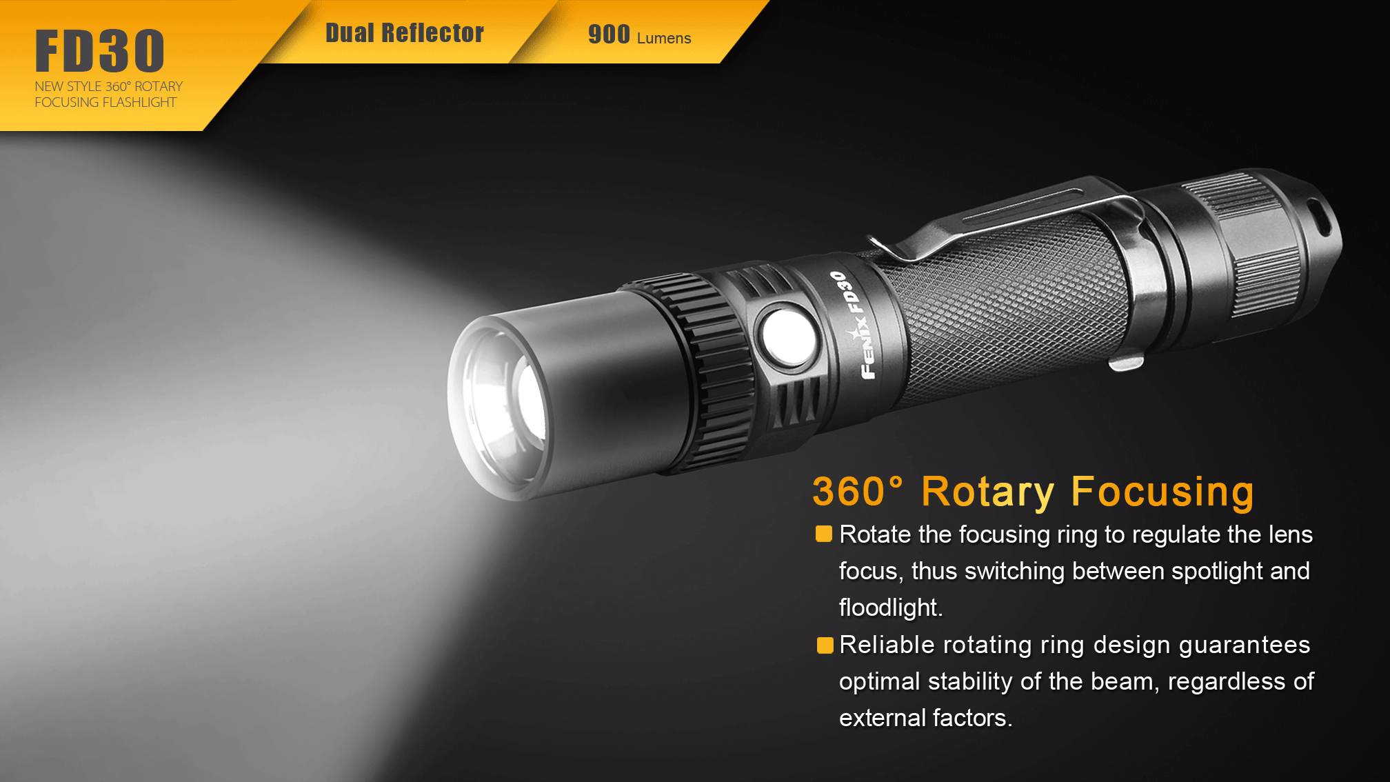 Zaostrovacia baterka Fenix FD30 ponúka extrémny svetelný tok 900 lúmenov a úctyhodný dosvit až 200 metrov. Ponúka tiež nastaviteľnú šírku kužeľa (zoom) od 7 do 76 stupňov. Svietidlo je možné napájať z dvoch jednorazových CR123A batérií alebo jedného vysokokapacitného li-ion 18650 akumulátora. Fenix FD30 disponuje šiestimi rôznymi režimami svietenia, ktoré umožňujú voliť medzi vysokým výkonom, dlhou výdržou a zábleskovým režimom pre upútanie pozornosti a krízové situácie. Svietidlo je napájané digitálne kontrolovaným konštantným prúdom pre zaručenie stáleho svetelného výkonu i pri znižovaní napätia v batériach (pri ich pozvoľnom vybíjaní). FD30 zaujme nielen kompaktnou veľkosťou a obrovským výkonom, ale aj možnosťou pripevnenia káblového spínača Fenix AER-02. Môžeme ju preto odporučiť na použitie v bezpečnostných zložkách aj bežné outdoorové a lovecké použitie.