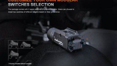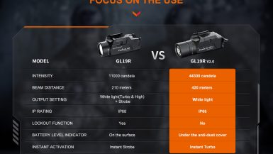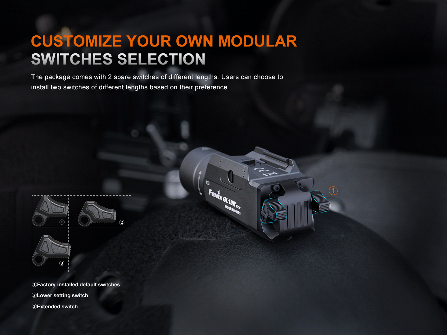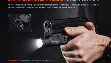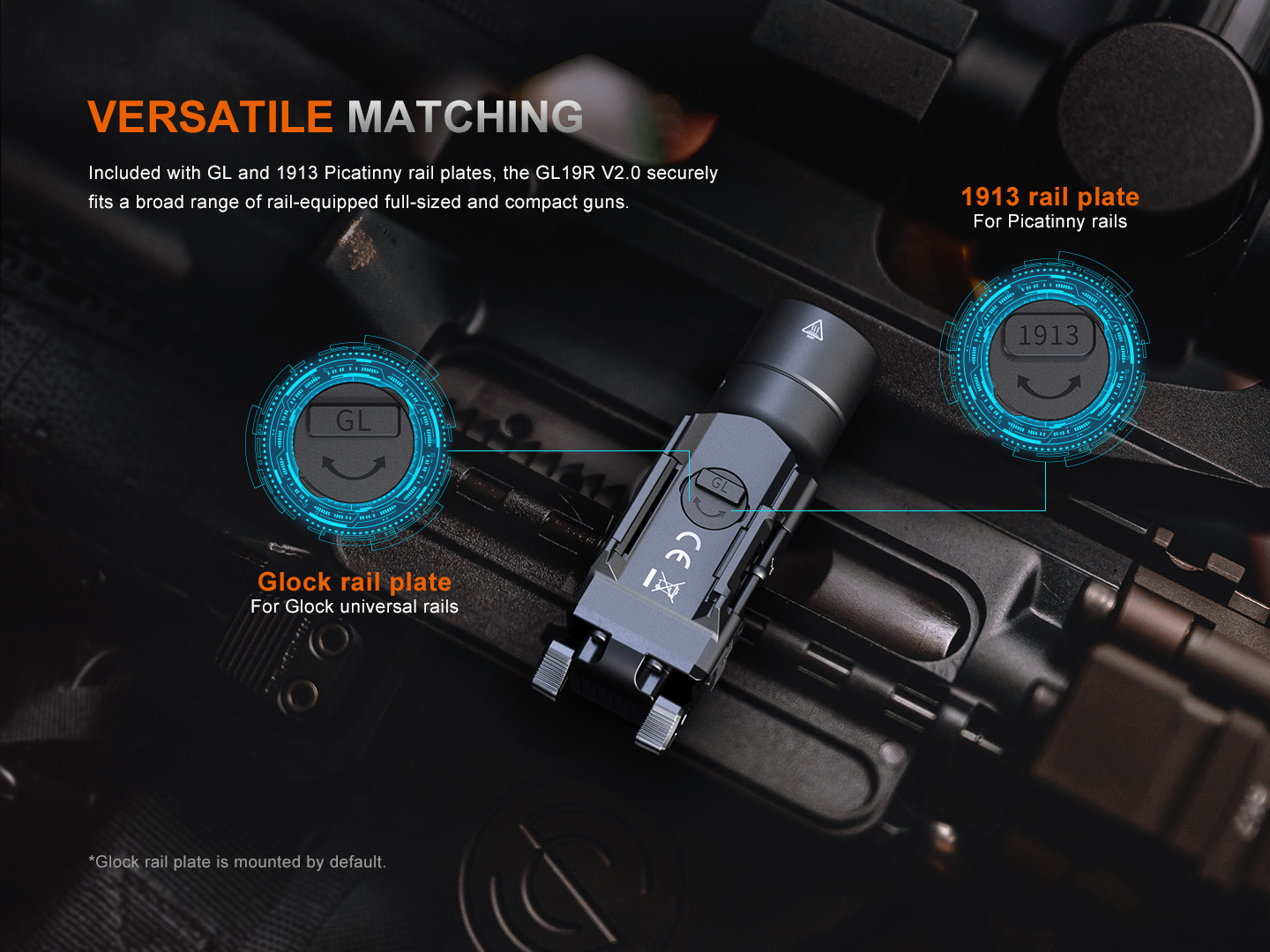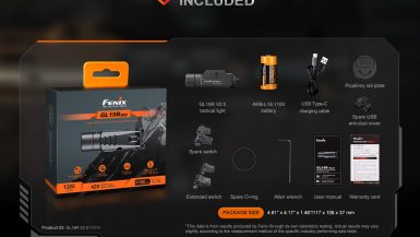 Nabíjateľné pištoľové LED svietidlo Fenix GL19R V2.0 je skonštruované špeciálne pre použitie na krátkych zbraniach. Ponúka špičkový výkon svetla 1200 ANSI lúmenov s dosvitom až 420 metrov. Svietidlo je napájané jedným Li-ion akumulátorom Fenix 18350 1100 mAh, ktorý sa dobíja priamo vo svietidle cez USB-C konektor na jeho boku a je súčasťou balenia. Zjednodušené ovládanie svietidla je obojstranné (pre pravákov aj ľavákov). Model GL19R V2.0 sa dodáva s tromi dĺžkami spínačov (univerzálne – namontované z výroby, skrátená a predĺžená verzia), ktoré je možné aj nakombinovať (na každú stranu svietidla použiť inú dĺžku spínača podľa osobných preferencií). Montáž na zbraňovú lištu je jednoduchá a nevyžaduje náradie – svietidlo sa nasunie na zbraňovú lištu a zaistí páčkou. Dá sa pripevniť na zbraňové lišty štandardu Picatinny MIL-STD-1913 a GLOCK (nemusí pasovať na zbrane z kategórie slimline, napr. model Glock 30). Pasuje na služobné zbrane Polície SR (CZ 75D). Svietidlo je tak vhodné pre profesionálov, športových a hobby strelcov aj airsoft.