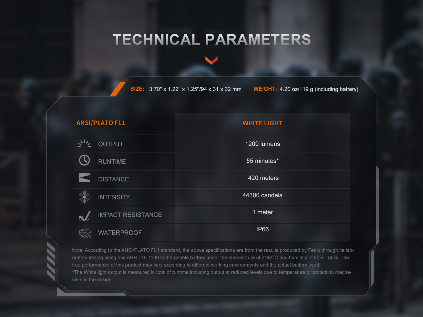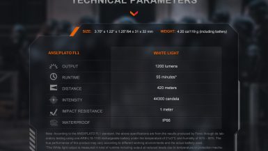 Všetky parametre svietidla (svetelný tok, doba prevádzky na batérie, vodotesnosť a dosvit) sú zmerané v súlade s normou ANSI/NEMA FL 1-2009.